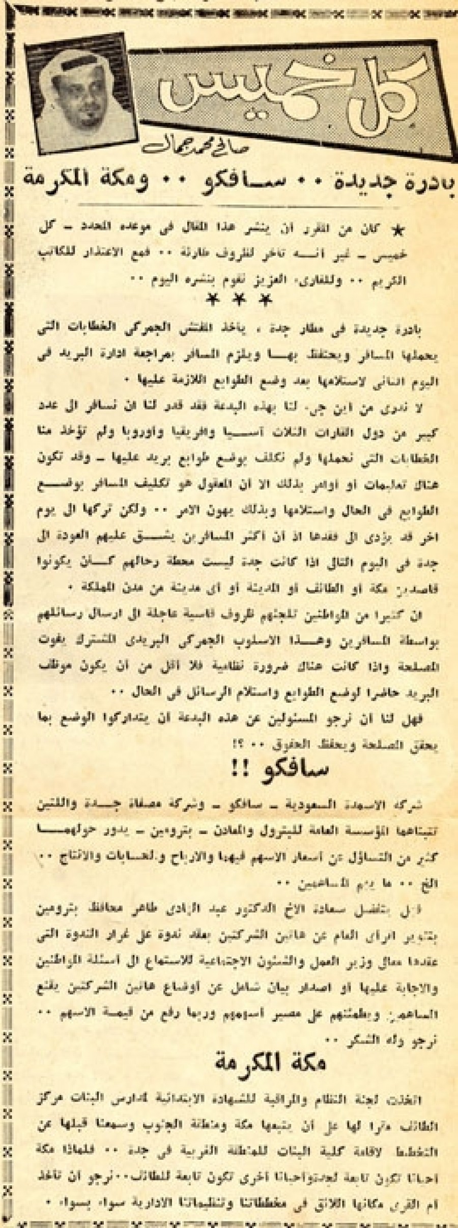 بادرة جديدة في مطار جدة، يأخذ المفتش الجمركي الخطابات التي يحملها المسافر ويحتفظ بها ويلزم المسافر بمراجعة إدارة البريد في اليوم الثاني لاستلامها بعد وضع الطوابع اللازمة عليها.