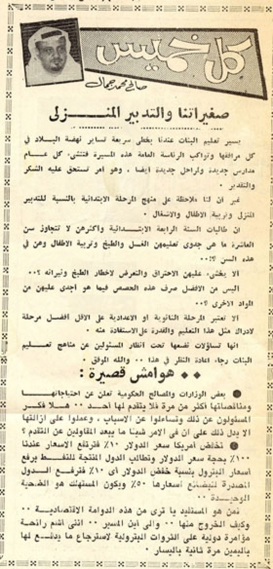 يسير تعليم البنات عندنا بخطى سريعة تساير نهضة البلاد في كل مرافقها وتواكب الرئاسة العامة هذه المسيرة فتنشئ كل عام مدارس جديدة ولمراحل جديدة أيضا، وهو أمر تستحق عليه الشكر والتقدير.
